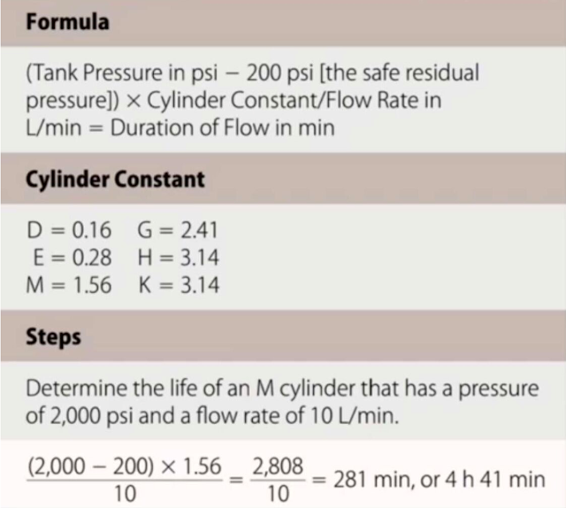 200 bares de presión - 10 (residuo) X 2 litros de capacidad = 25,3 Minutos