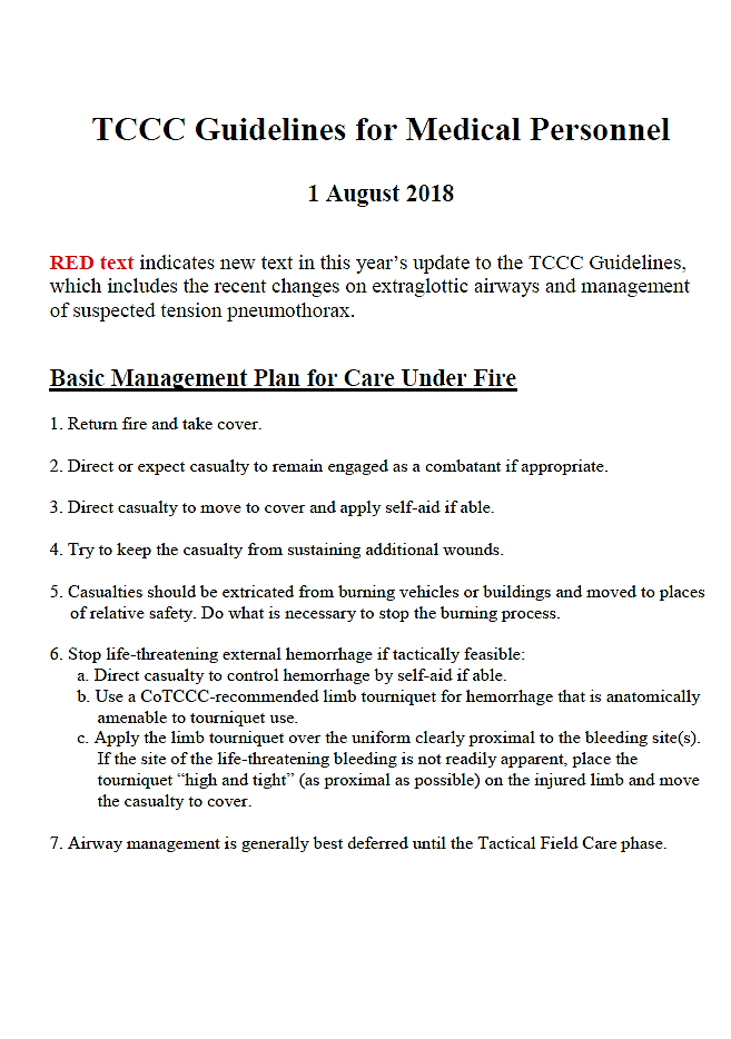 Current Tactical Combat Casualty Care (TCCC) Guidelines as of 01 AUGUST 2018 . The TCCC Guidelines are the standard of care for the modern battlefield.
