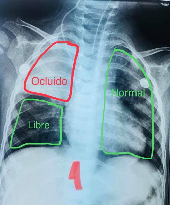 Niño de 2 añitos proveniente de Concepción, estaba comiendo “mandarina”, empieza con tos intensa, realiza un Paro Respiratorio, es reanimado e intubado y derivado al INERAM, fíjense en la placa número 1 es al ingreso se ve una atelectasia del lóbulo superior derecho ( oclusión, está cerrado el lóbulo superior derecho, lo BLANCO), en horas se vuelve a realizar pre broncoscopia una placa de control la numero 2 se observa una neumonía pos obstructiva ( cuerpo extraño) además el pulmón izquierdo muestra una disminución de su tamaño por probable atelectasia parcial del mismo( se está por ocluir todo el pulmón izquierdo) o sea el cuerpo extraño pasó de un lado del pulmón al otro!!! Cuando ingreso certificó que la semilla está ocluyendo totalmente el bronquio fuente izquierdo(todo el pulmón). Procedo a extraer corroborando ser una semilla. Fíjense la situación, Paro respiratorio, neumonía post obstrucción, situación gravísima, el Niño está bien y recuperándose en terapia.