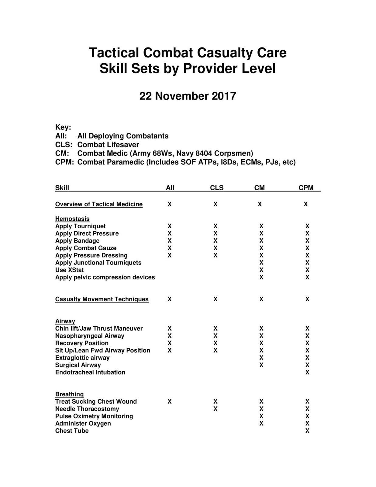 TCCC Tactical Combat Casualty Care Skills Sets by Provider Level