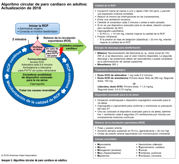 La actualización del 2018 de las Guías de la American Heart Association para la Atención Cardiovascular de Emergencia se centran en el uso de agentes farmacológicos antiarrítmicos para el tratamiento del paro cardiaco por fibrilación ventricular (FV) o taquicardia ventricular (TV) sin pulso. Esto aplica a los cursos ACLS y PALS.