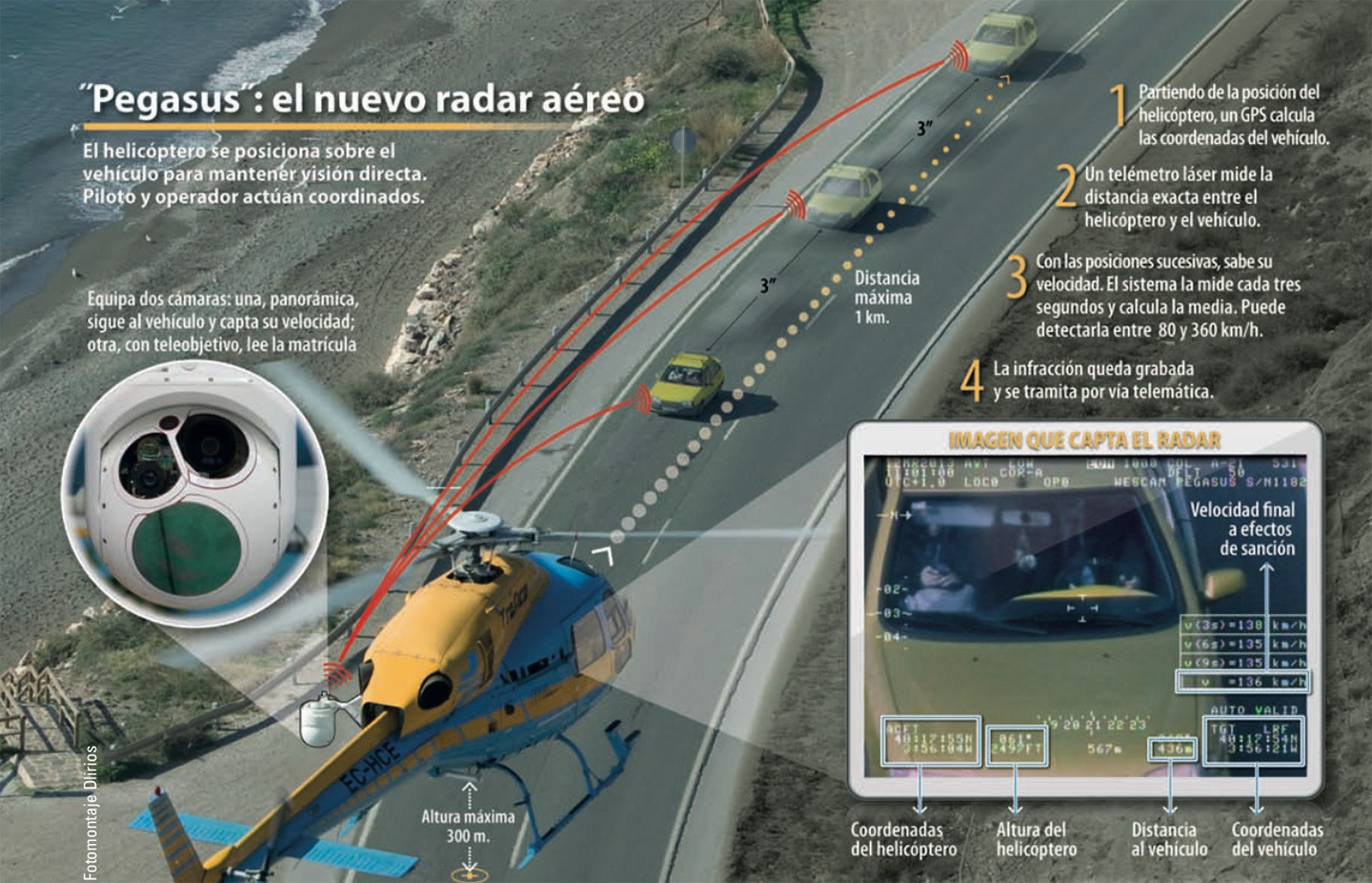 El nuevo radar aéreo aporta una ventaja: es más selectivo y permite observar el comportamiento de los conductores identificando las conductas de riesgo. Pegasus puede actuar desde una altura de 300 metros y a un kilómetro de distancia del objetivo. La finalidad del sistema es conocer las coordenadas geográficas (latitud y longitud) del vehículo al que se está controlando para calcular su velocidad. En primer lugar, sitúa la posición del helicóptero en el espacio con extraordinaria precisión, a través de varios mecanismos (giróscopos y acelerómetros) y un programa informático añadidos a las cámaras de vigilancia. A continuación, un láser mide la distancia entre el helicóptero y el vehículo cada tres segundos. Con estos datos puede conocer las sucesivas posiciones del vehículo y calcular su velocidad media a efectos de sanción. Confirmada la infracción, un fotograma de la grabación se envía telemáticamente como prueba al Centro de Tratamiento de Denuncias Automatizadas (ESTRADA) desde donde se tramita. E incluso está prevista la actuación inmediata en casos de delito, contactando desde el mismo helicóptero con una patrulla de la Guardia Civil.