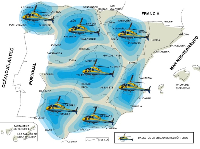 Entre 1965 y 1975 se crean las bases permanentes de Bilbao, Sevilla, y Valencia. En 1989 se crea la base de Málaga, mientras que en el año 2000 se transfieren a la Generalitat de Cataluña las competencias en materia de vigilancia en carretera con la base de helicópteros incluida. En 2001 se crean las bases de A Coruña y Zaragoza. Finalmente, tras la creación en 2008 de la base de Valladolid, la situación y ámbito habitual de actuación en cada base queda determinada como se refleja en la imagen.La Unidad de Helicópteros de la Dirección General de Tráfico es la unidad de vuelo más antigua del Ministerio del Interior, teniendo hasta la fecha una experiencia acumulada de más de 200.000 horas de vuelo.