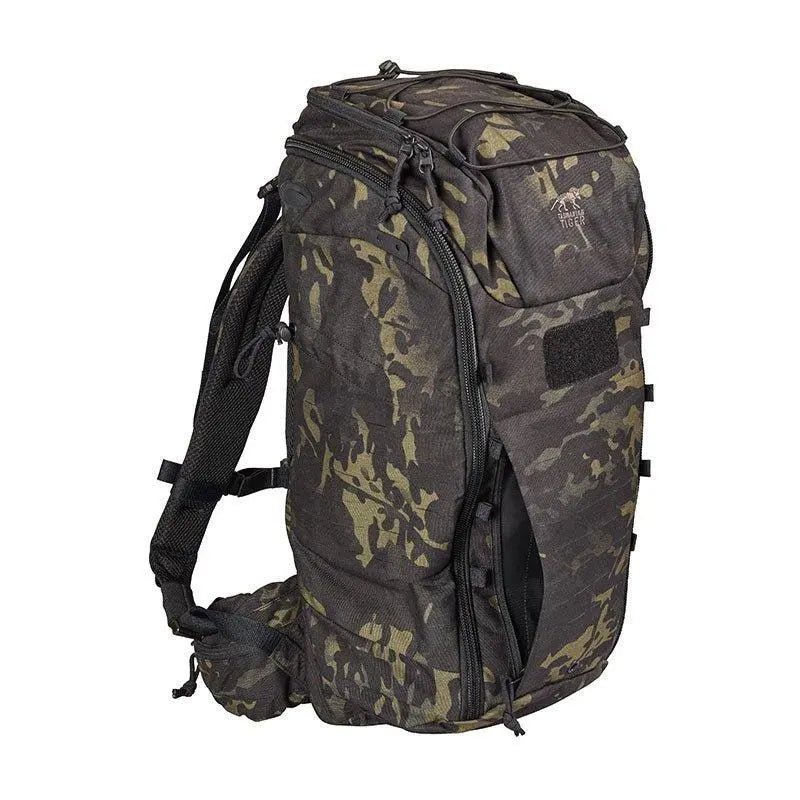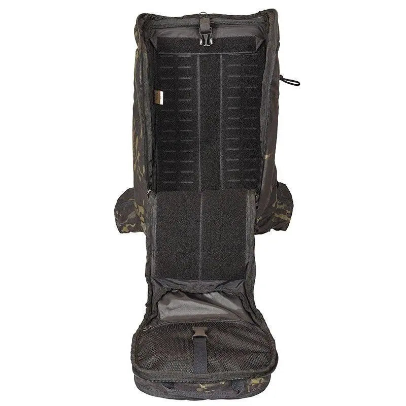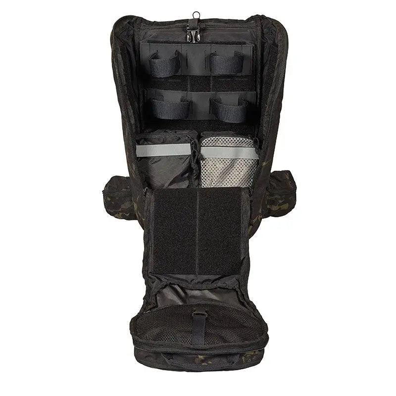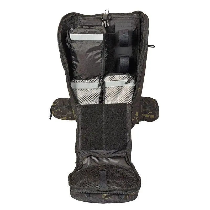 The main compartment of the backpack can be opened completely from the front or back side, and the hook and loop partition can be removed all together if need be. The back and side panels of the main compartment feature MOLLE hook and loop patches for customizable configurations.