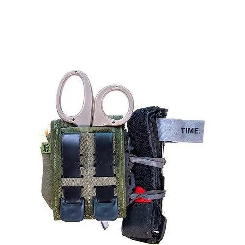 The ReVive™ is a compact pouch designed to carry immediately accessible, essential medical gear. The pouch is built around treating a gunshot wound and is intended to fit a chest seal, 4" trauma dressing, combat gauze, trauma shears and two pairs of nitrile gloves, but will also fit other similar items. The patent-pending RipCord™ insert enables the contents to be quickly and easily deployed within a self-contained harness, preventing users from fumbling for the needed item or dumping the contents of the pouch.