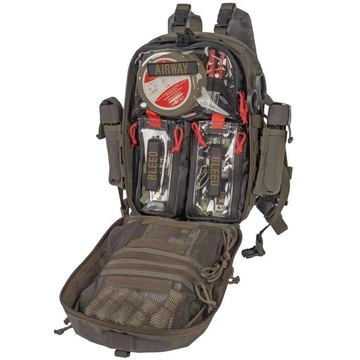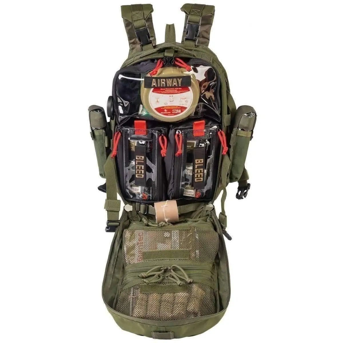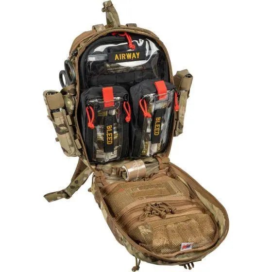 El interior de la bolsa tiene dos bolsas transparentes pequeñas y una grande para guardar suministros de equipos médicos u otros equipos. Además de dos bolsas interiores de malla y una bolsa interna en la tapa interior, existen muchas opciones de almacenamiento. El Mini Medic Kit es una bolsa compacta y versátil equipada con equipo médico esencial para tratar a múltiples víctimas.