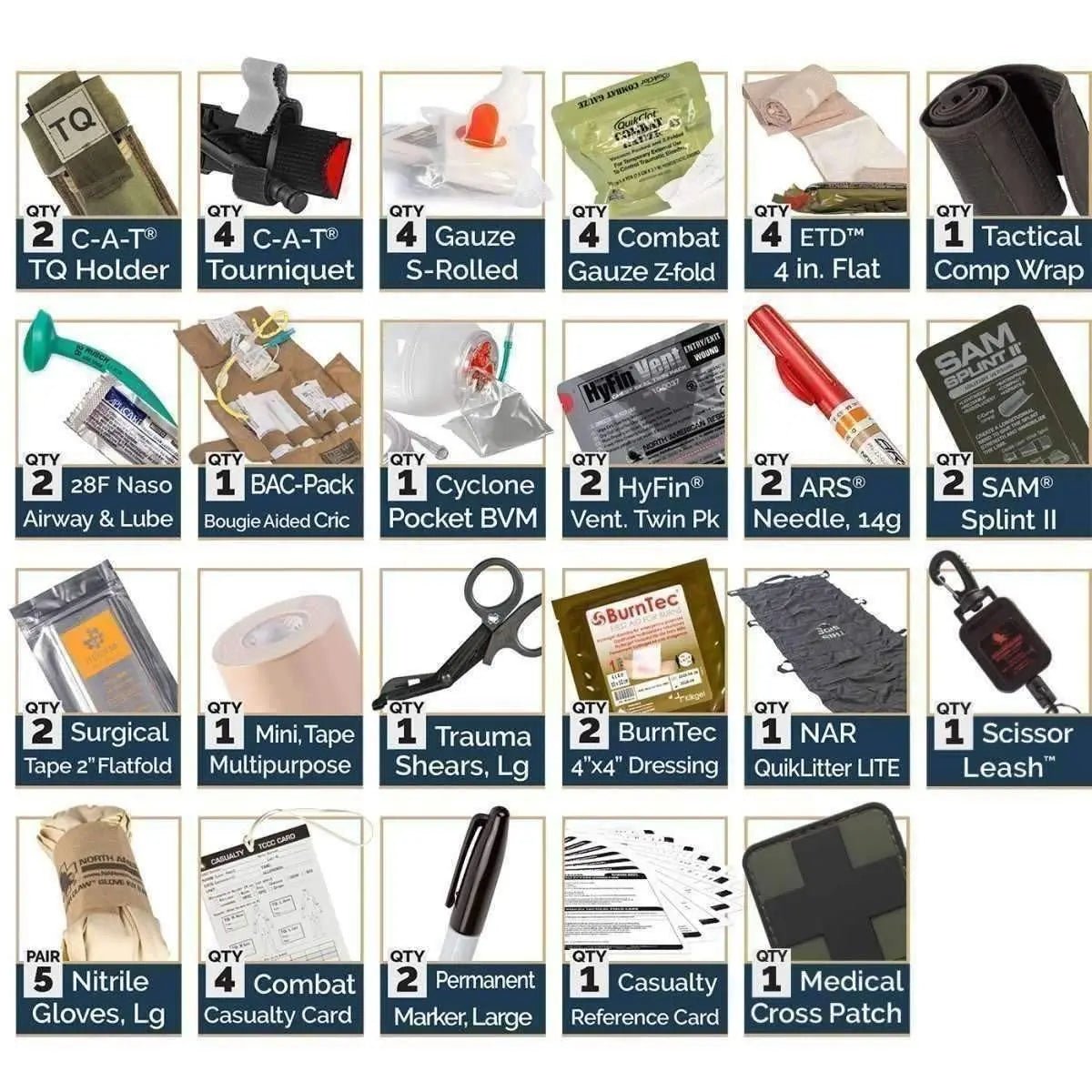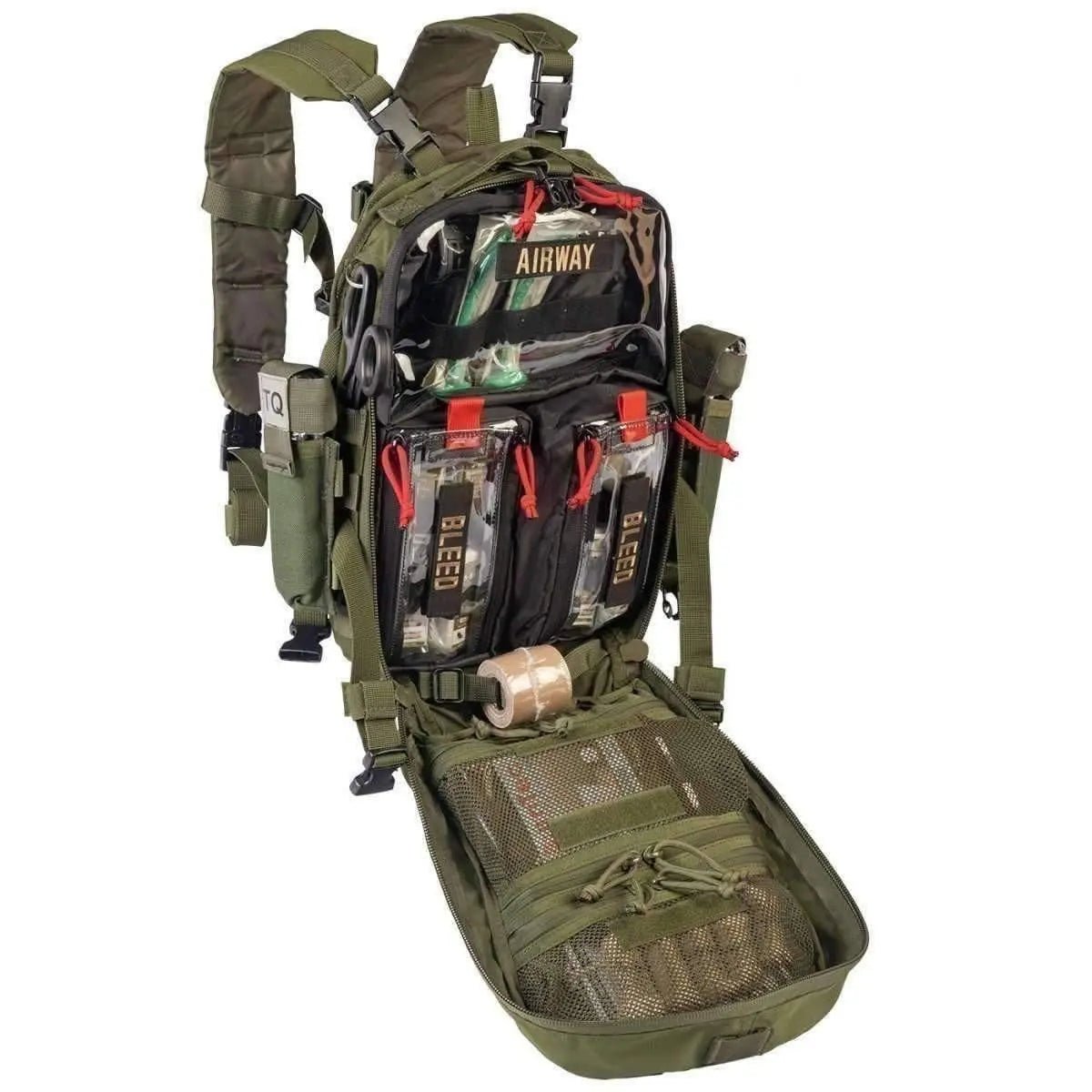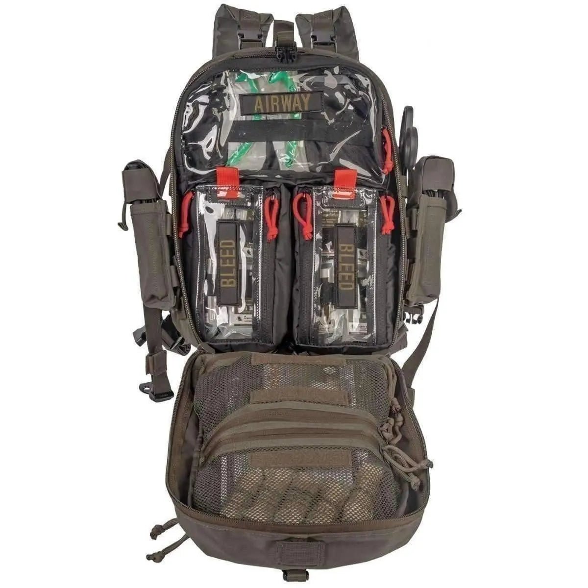 El interior de la bolsa tiene dos bolsas transparentes pequeñas y una grande para guardar suministros de equipos médicos u otros equipos. Además de dos bolsas interiores de malla y una bolsa interna en la tapa interior, existen muchas opciones de almacenamiento. El Mini Medic Kit es una bolsa compacta y versátil equipada con equipo médico esencial para tratar a múltiples víctimas.