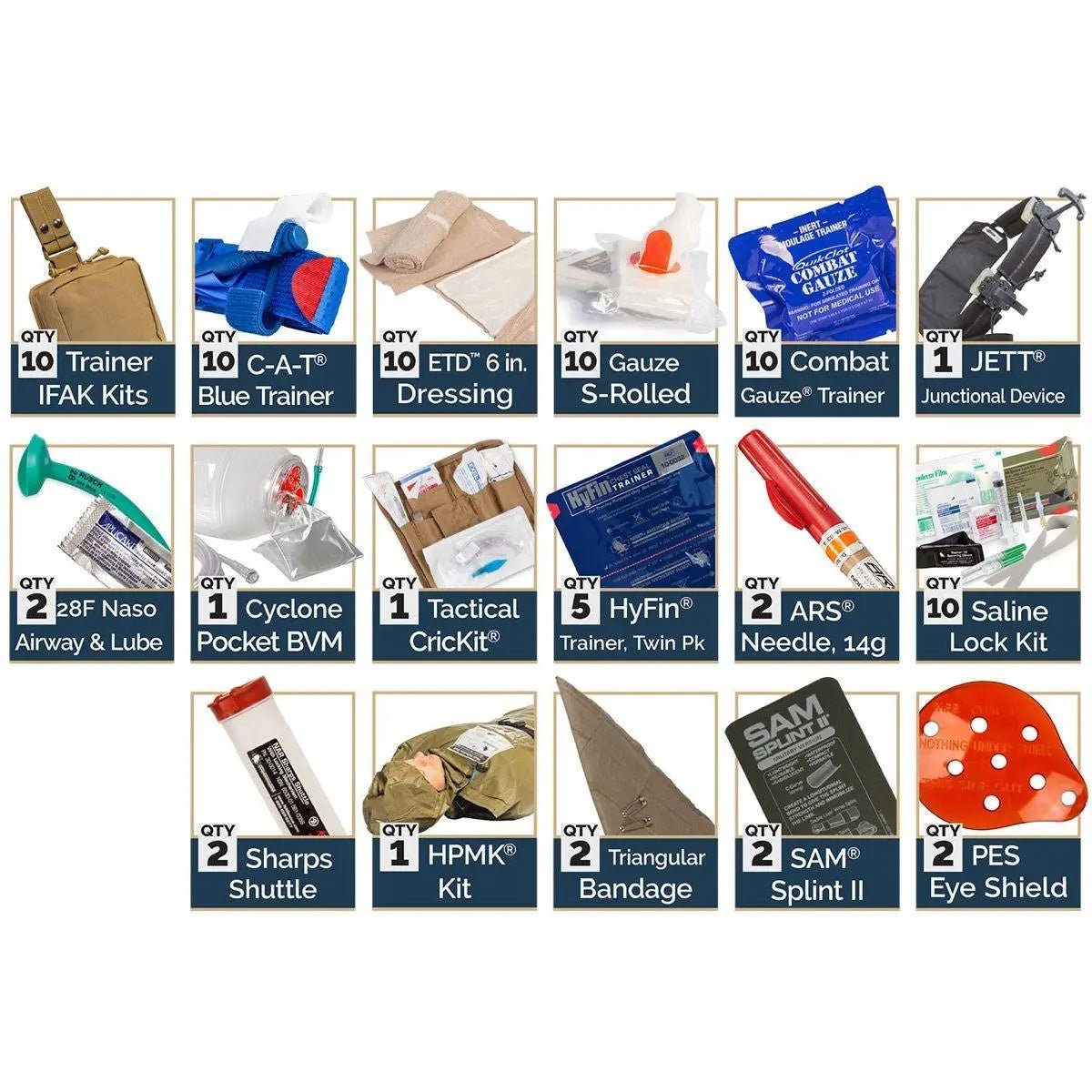 - Contiene 10 IFAK de capacitación de TCCC preempaquetados para que los usen los estudiantes durante las líneas de trauma o escenarios de capacitación.