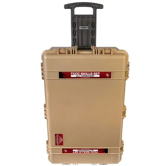 Contents are packaged in a self-contained, wheeled, rigid case with internal dividers to keep the equipment organized and easy to inventory. Addresses extremity hemorrhage, wound packing, chest seal application, needle chest decompression, basic airway adjuncts, splinting, hypothermia prevention & management, and eye injuries.