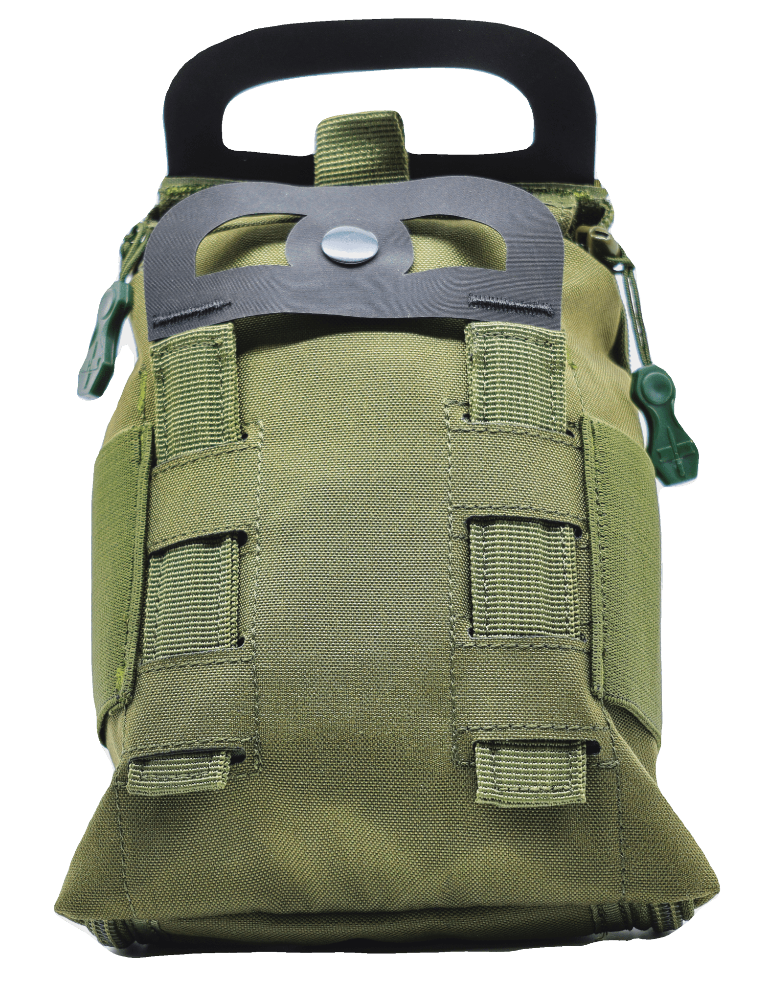 The bag features 2 integrated tourniquet side holders, where they should be...outside, and ready to grab. The rubber pulls handles on top make it extremely fast to open and access the laser cut interior, which features an intelligent mix of old school proactive pouches and newer styles of modular shock cord retention system.