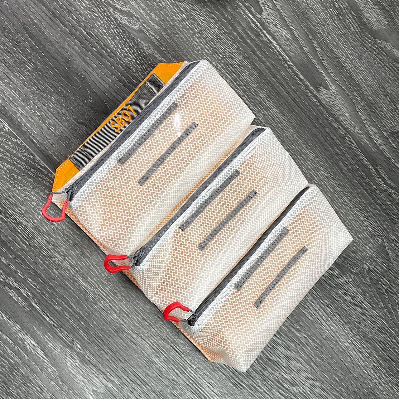 - Three vinyl mesh zippered pouches for easy storage (8” x 3.25” x 2.25”)