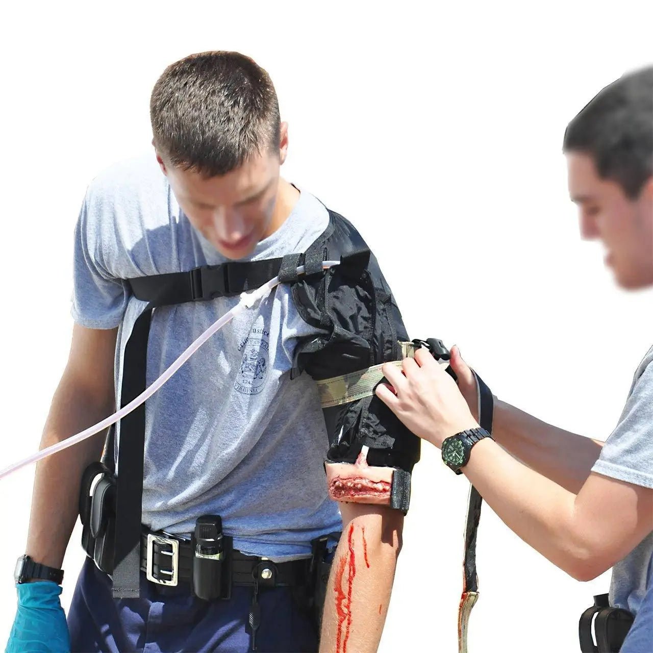 Proper tourniquet placement and application are crucial to effective hemorrhage control. The TrueClot® Tourniquet Application Trainer is a wearable device that allows full application of a tourniquet for training purposes. Training blood can be pumped through the device to simulate hemorrhage, and when a tourniquet is correctly applied, bleeding is stopped. The padded arm cuff reduces pinching and pain and allows for proper application of a tourniquet during classroom or scenario training. The trainer can be worn under a uniform or large t-shirt.